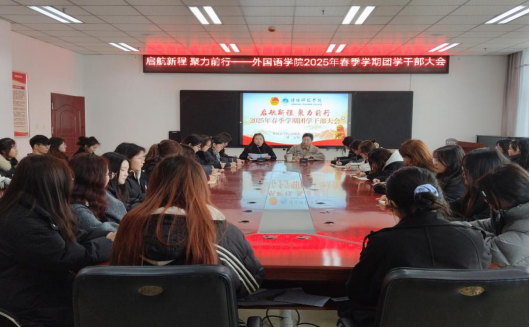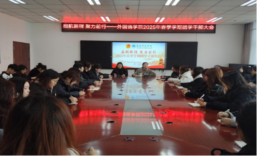 为加强团学干部队伍思想政治建设,提升团学干部的综合素质和工作能力,确保新学期学生工作顺利开展,外国语学院于2月27日在行政楼532以“启航新程,聚力前行”为主题召开2025年春季学期团学干部大会。学院党委副书记、纪委书记崔芸,全体团学干部参加会议,会议由分团委书记、学办主任罗春艳主持。